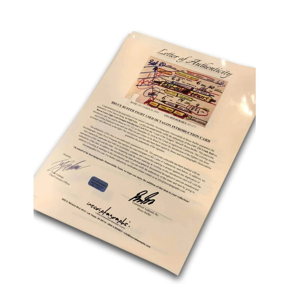 This fight list will come with a letter of authenticity from Inscriptagraphs memorabilia & Bruce Buffer directly. Inscriptagraphs is one of the largest & most reputable memorabilia companies in the world and sells authentic unique collectibles you will not find anywhere else. In addition, the fight list & letter will come with a tamperproof hologram to prevent tampering & forging. You will be able to head to Inscriptagraphs' website to verify the authenticity of this card for life and have access to the verification system as proof of authenticity 24/7/365. A hologram will be added to the back of the list for its authenticity for life.