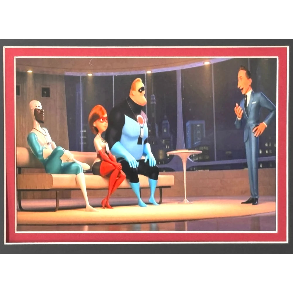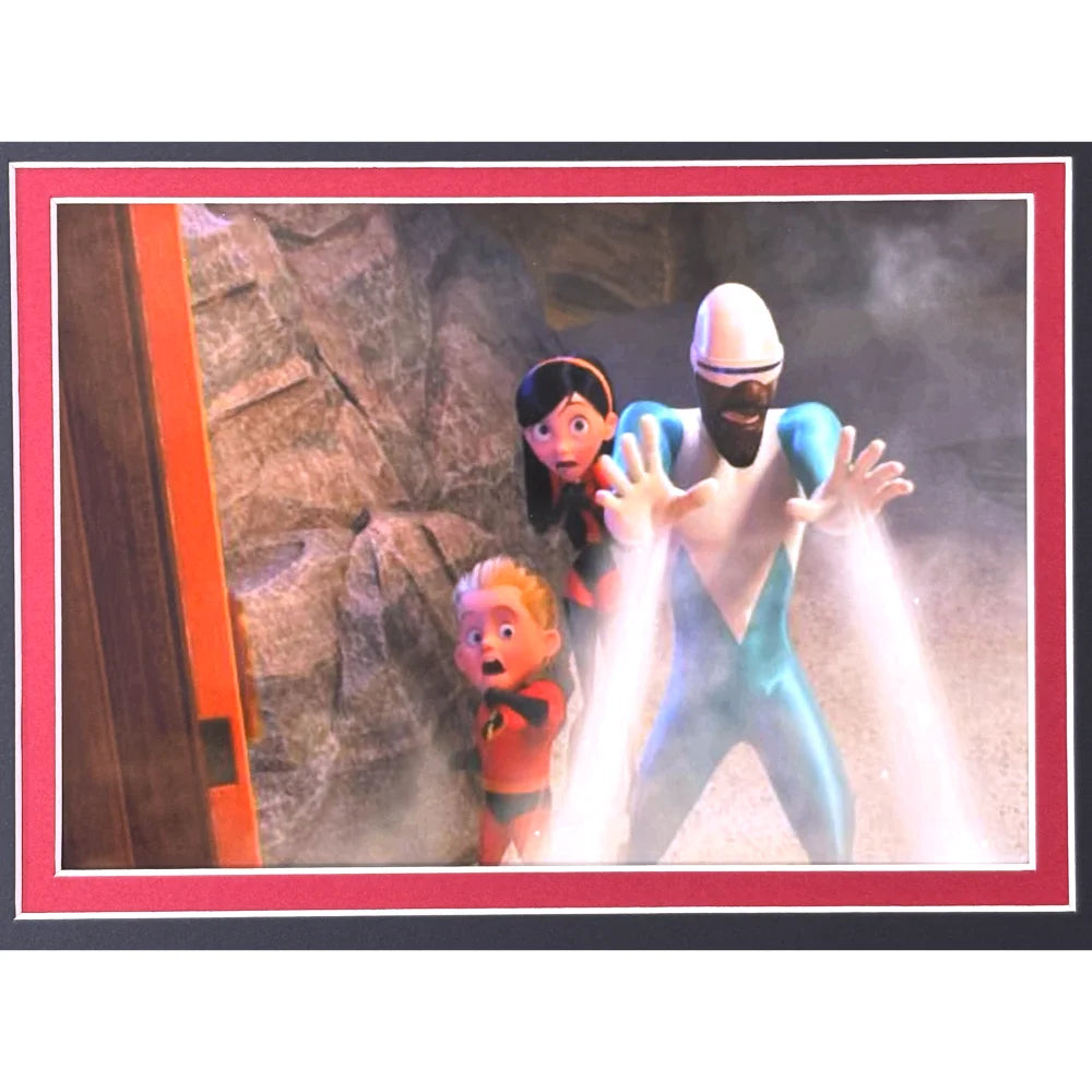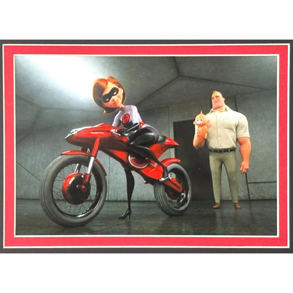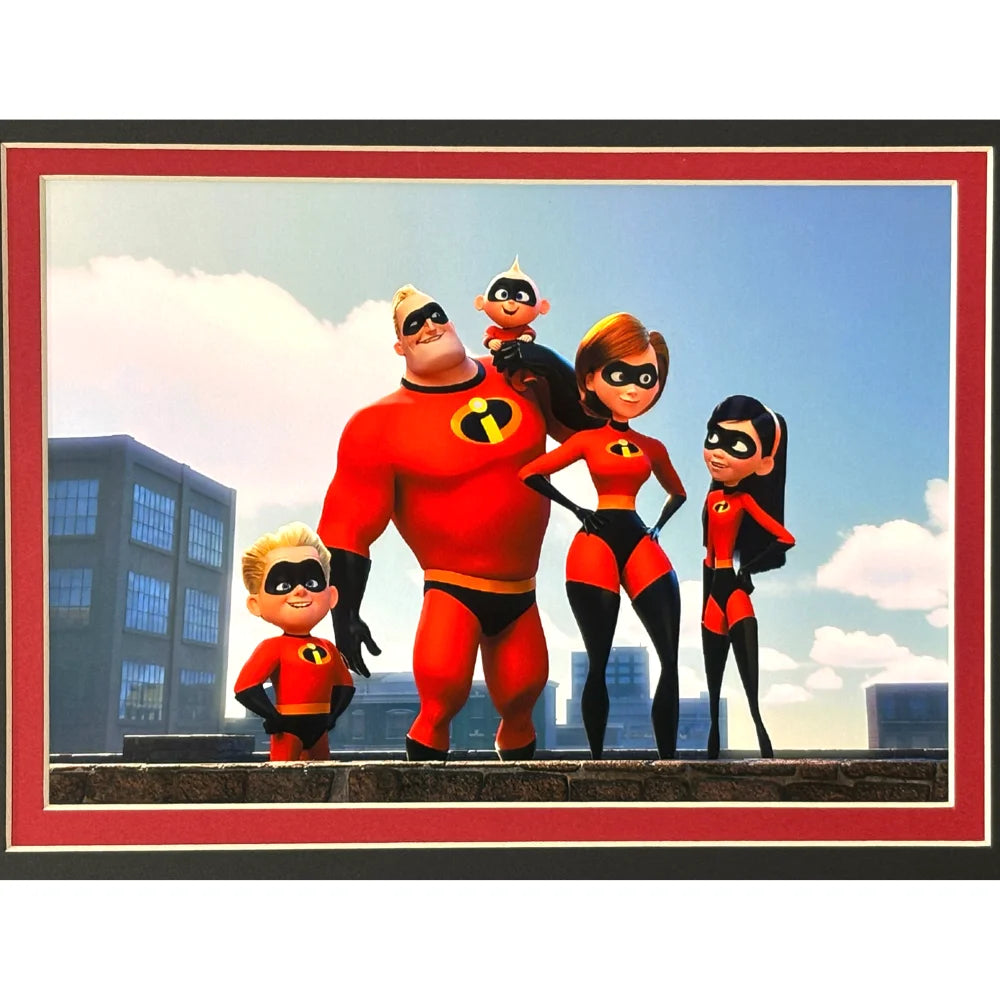 At the heart of this piece is a central poster hand-signed by the talented cast: Craig T. Nelson as Mr. Incredible, Holly Hunter as Elastigirl, Bob Odenkirk as Winston Deavor, Sarah Vowell as Violet, Catherine Keener as Evelyn Deavor, Samuel L. Jackson as Frozone, Jonathan Banks as Rick Dicker, and Brad Bird as Edna "E" Mode. Surrounding the autographed poster are four 5x7 photos depicting iconic scenes from the movie, showcasing the family's heroic exploits and memorable moments.