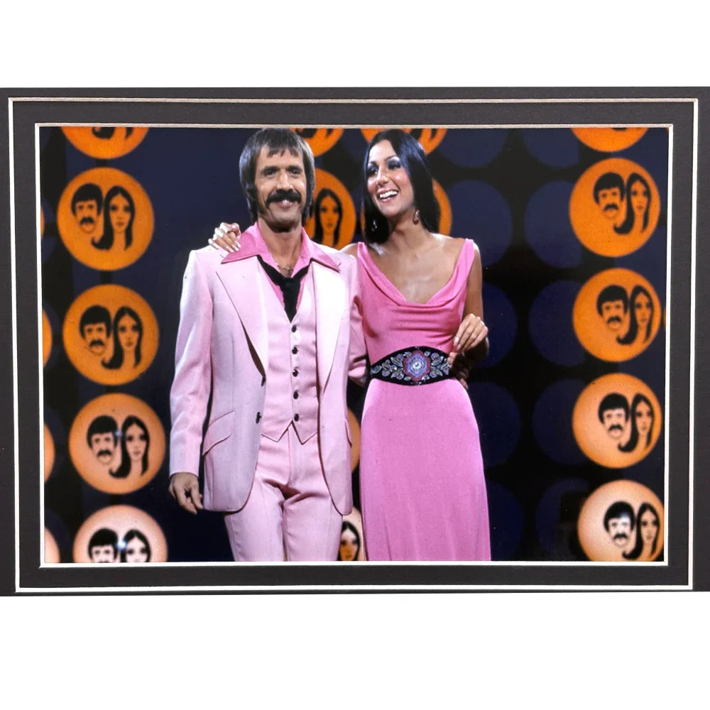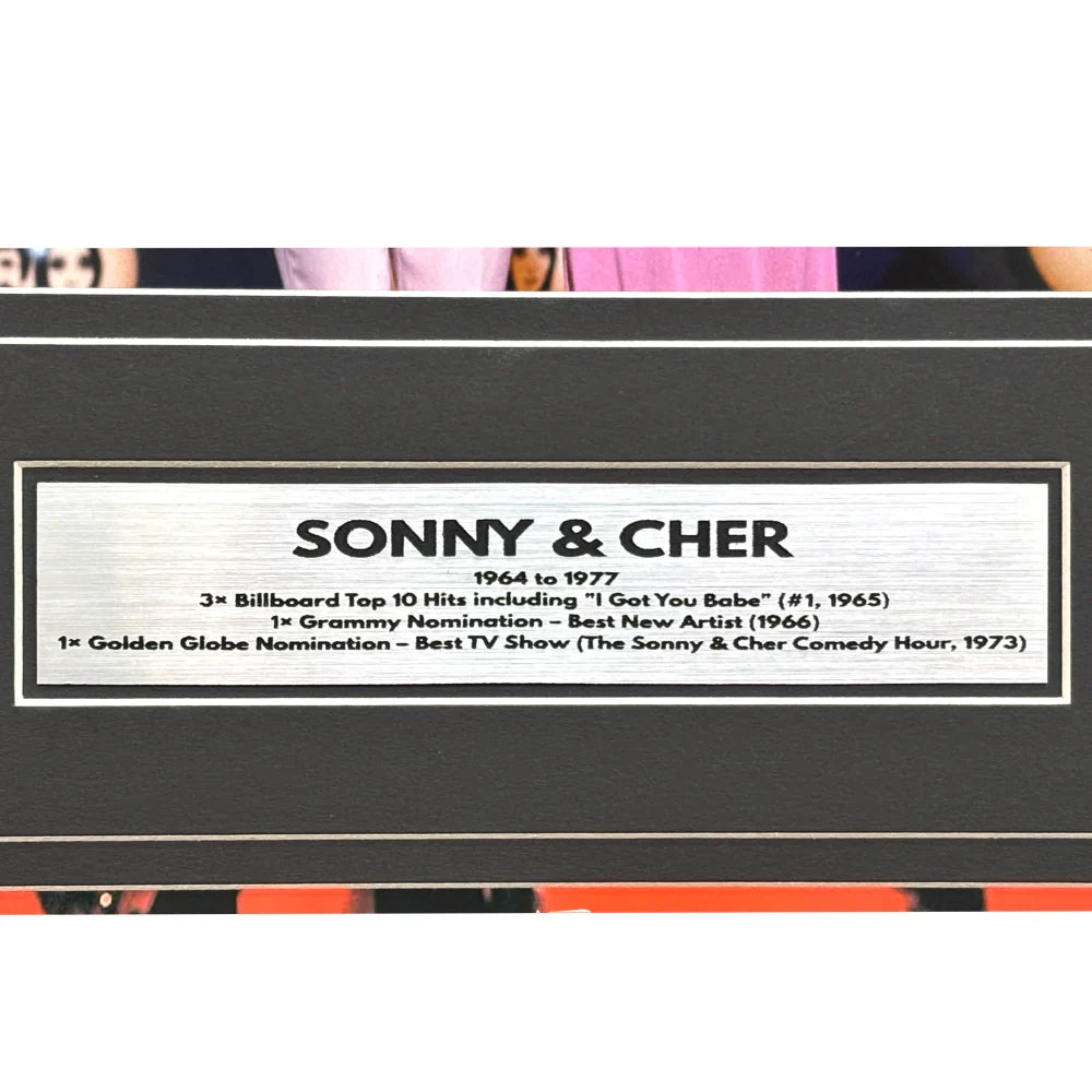At the heart of this display is an authentic 11x14 photograph hand-signed by Cher, featuring a picture of Sonny & Cher together, expertly framed for preservation. The centerpiece is complemented by two 5x7 photographs: one capturing Sonny & Cher in their early 1960s performance attire and another from their 1970s Comedy Hour era. A silver nameplate reading “Sonny & Cher” adds a distinguished touch.