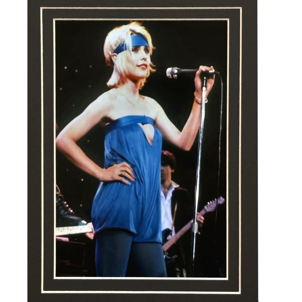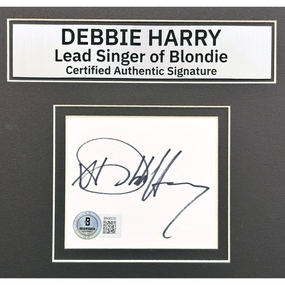 At the heart of this display is an authentic cut hand-signed by Debbie Harry, expertly framed for preservation. The centerpiece is complemented by five 5x7 photographs: two of her performing with Blondie and two capturing her solo artistry. A silver nameplate reading “Debbie Harry” adds a distinguished touch, with the band Blondie’s description cut into the matting: “Blondie, formed in 1974, is a pioneering New York punk and new wave band, blending punk energy with pop sensibilities, led by Debbie Harry and Chris Stein, with hits like ‘Heart of Glass’ and ‘Rapture’ shaping the 1970s and 1980s music scene.”