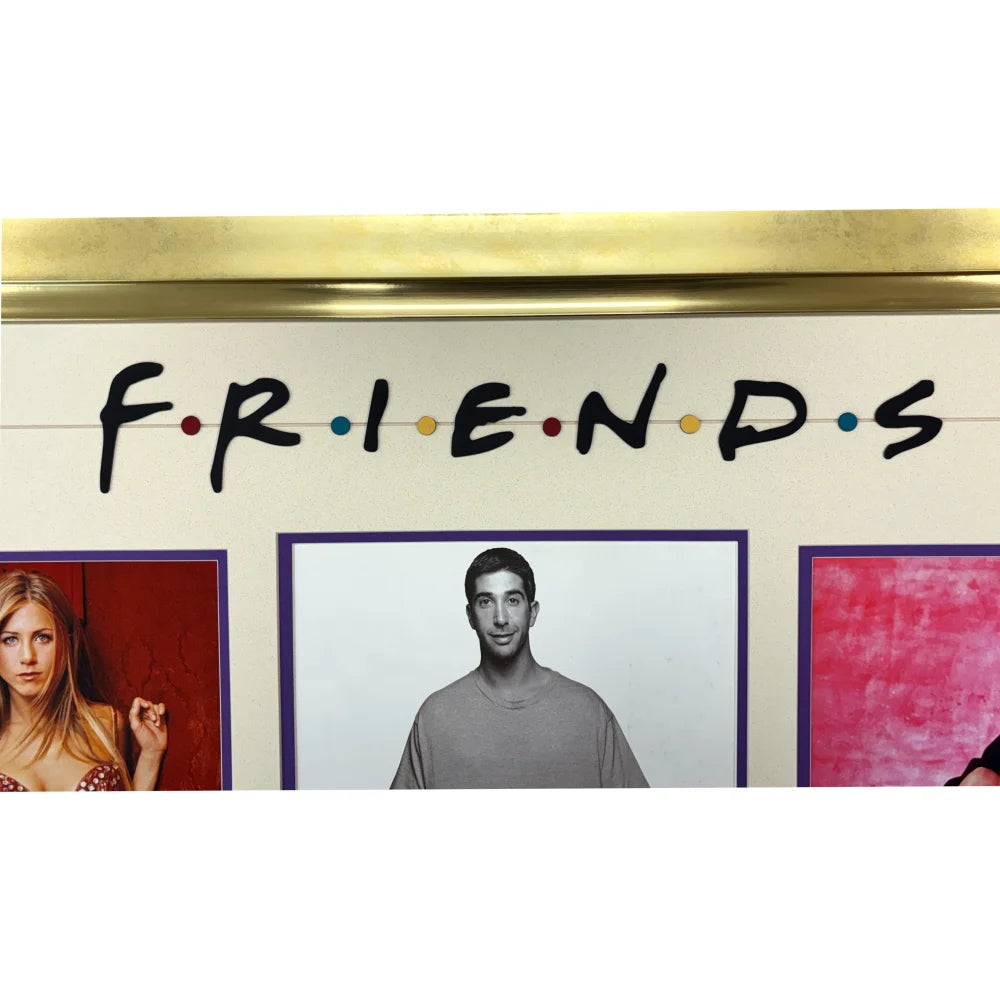 At the centerpiece is the classic “F.R.I.E.N.D.S.” logo title treatment in the signature dotted style, surrounded by six individual signed photographs. Five are authentic 8x10 photos, and the Matt LeBlanc autograph is on a 4x7 photograph, all hand-signed by the respective cast members in bold marker. The display features striking, character-defining images that capture the essence of each beloved character.