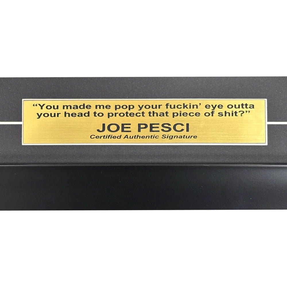 Enhancing the cinematic presentation are a replica Tangiers Casino metal chip and a pair of custom fantasy Tangiers playing cards (9 of Diamonds and 6 of Diamonds), evoking the high-stakes Las Vegas underworld depicted in the film. A striking gold engraved nameplate proudly reads “NICKY SANTORO”, paired with a bottom gold plaque featuring Pesci’s chilling line: “You made me pop your f*ckin’ eye outta your head to protect that piece of sh*t?” — Certified Authentic Signature.