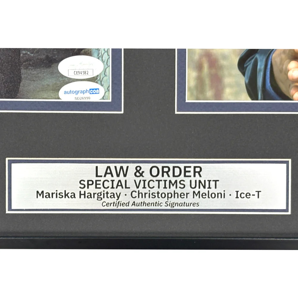 At the core of this display are two 8x10 photographs capturing memorable moments from the series. One photo is hand-signed by Mariska Hargitay and Christopher Meloni, showcasing their dynamic partnership, while the other is hand-signed by Ice-T, highlighting his tough detective persona. These autographed images bring the intensity of SVU to life in a stunning presentation.