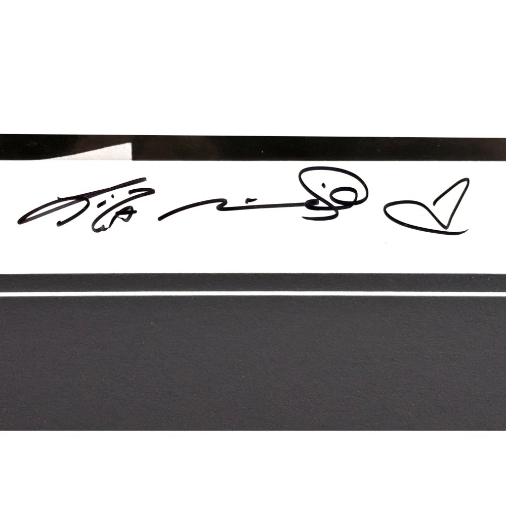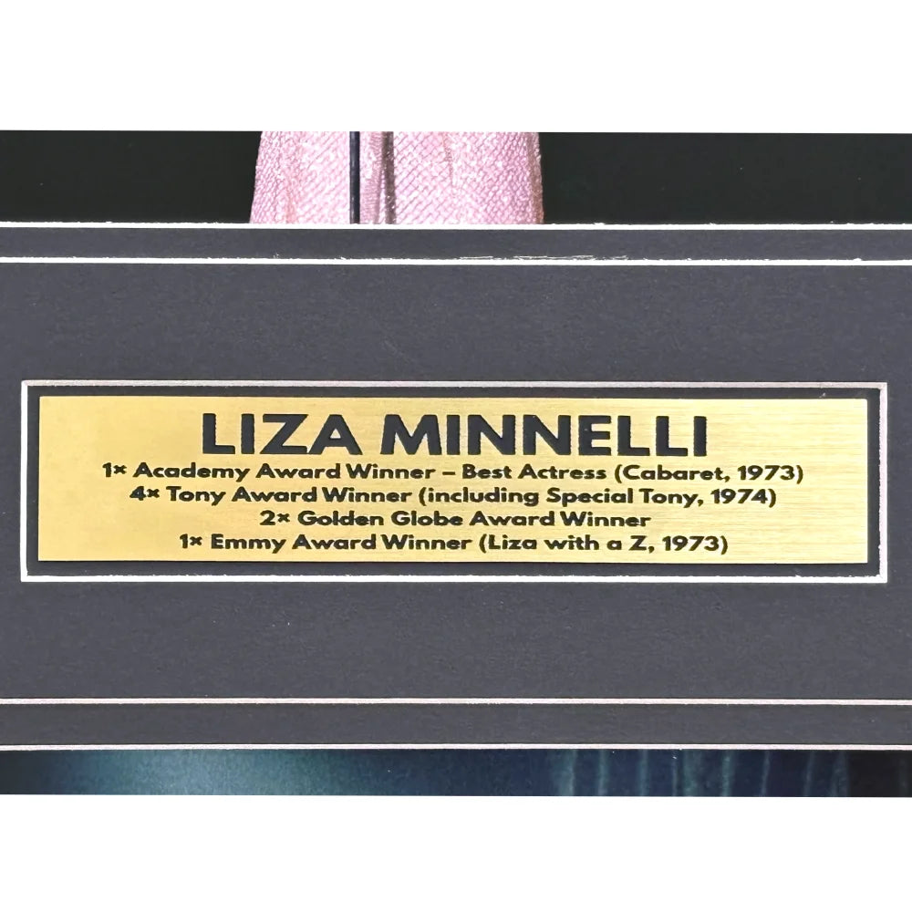 At the heart of this display is an authentic 8x10 photograph hand-signed by Liza Minnelli, expertly framed for preservation. The centerpiece is complemented by two 5x7 photographs: one of her iconic Cabaret role and another from a live performance. A gold nameplate reading “Liza Minnelli” adds a distinguished touch.
