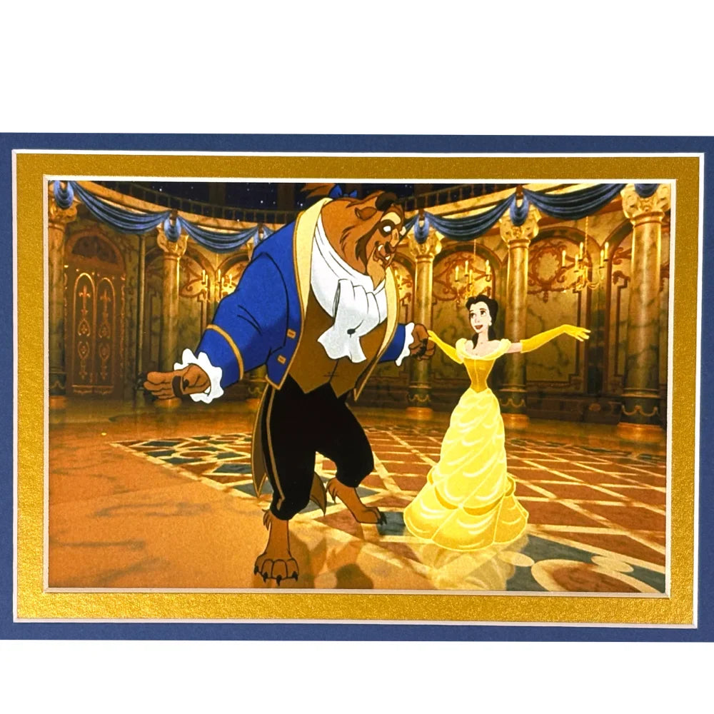 The signed photo is complemented by two 4x6 scene photos from the movie, each showcasing the magic and romance of Beauty and the Beast. The display is completed with a gold nameplate engraved with the actors’ names and film title, all presented in a custom-designed gold frame with blue matting for an elegant finish.