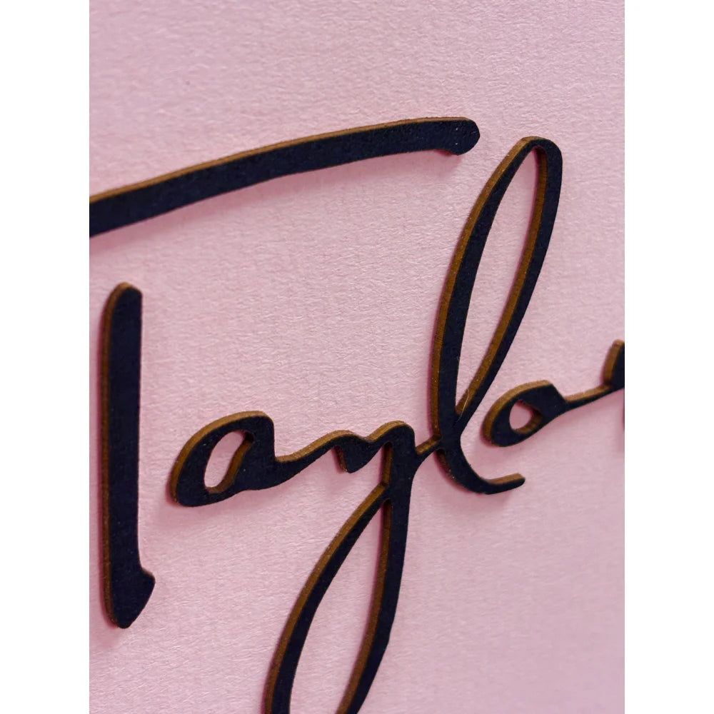- Double matting with a pink top mat and 3D laser-cut lettering in the font from her debut album as a nod to her roots.