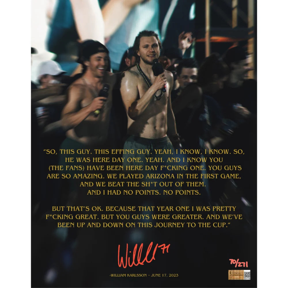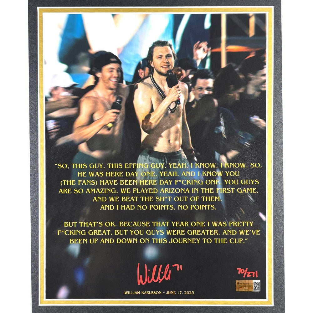 Vegas Golden Knights fans and collectors — this is the ultimate display piece! William Karlsson’s shirtless, iconic 2023 Stanley Cup Parade speech is captured in this autographed 11x14 photo, with the exact words from his legendary speech printed directly on the image. Even better, this is a limited edition collectible with only 271 produced worldwide. Each photo is signed in bold paint pen, making it perfect for fans who want the centerpiece of VGK’s championship celebration.