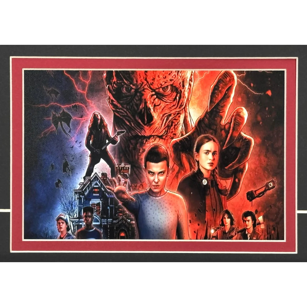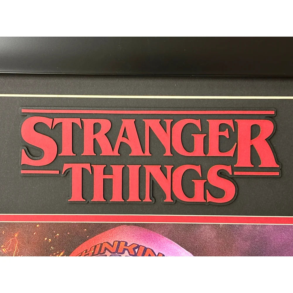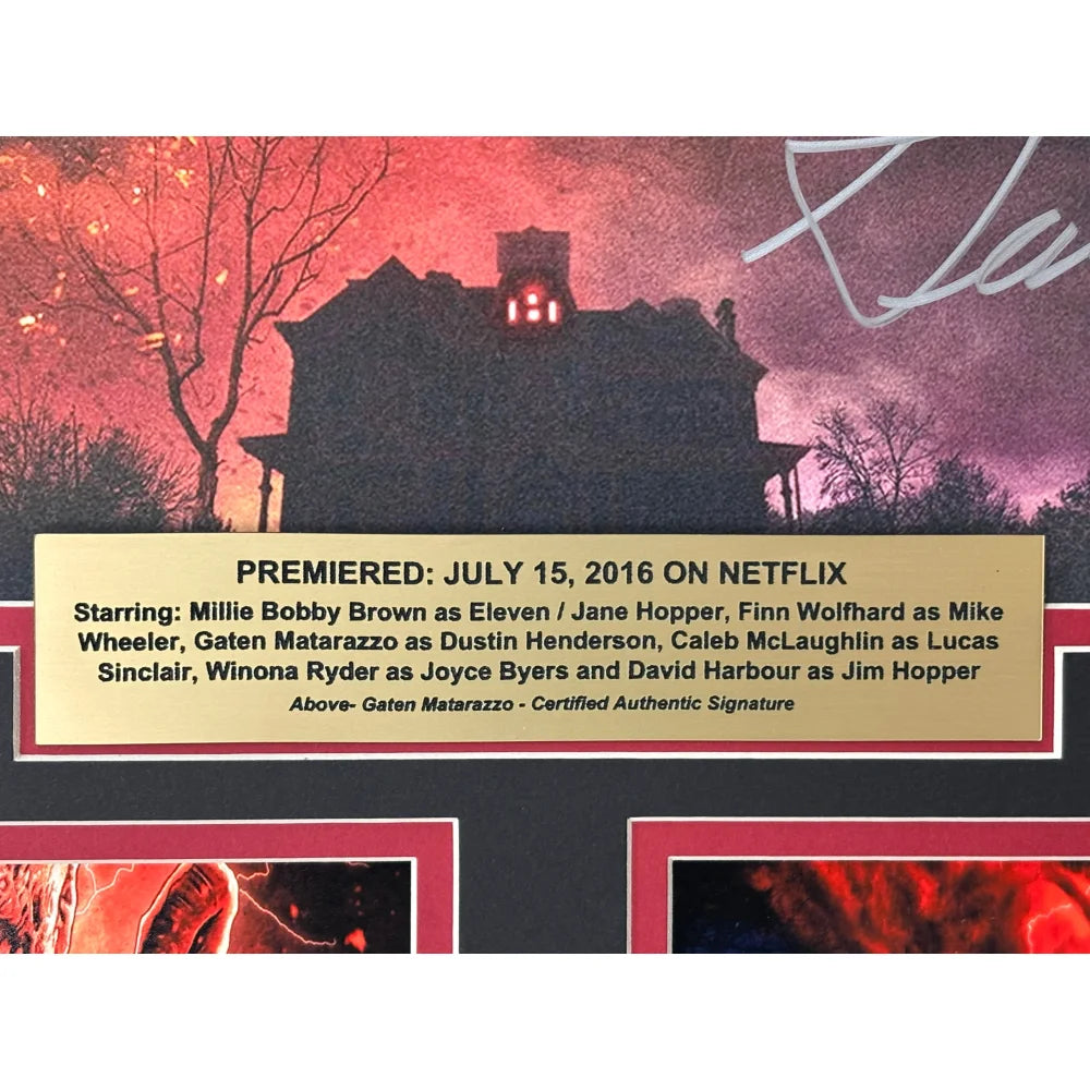 This display is crafted using super high-end, high-quality framing techniques, the same standard used in museum and gallery installations. It features a brand new sleek black frame, measures approximately 18.5" x 27.5", and includes double matting beneath a protective glass display. At the top sits a raised 3D laser-cut “Stranger Things” logo, engineered to add depth, dimension, and an elevated, custom-crafted look. A gold laser-engraved nameplate provides detailed information about Gaten Matarazzo and his character Dustin, completing a cinematic layout that stands out visually from every angle. This type of custom framing and laser-cut work is highly sought after and very expensive to produce due to the premium craftsmanship and materials involved. The piece arrives ready to hang with a wire-back mounting system for instant display.