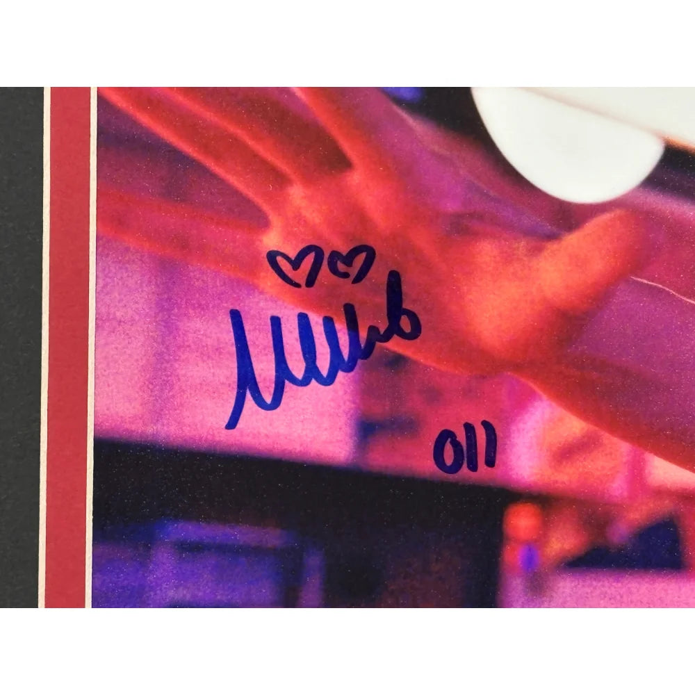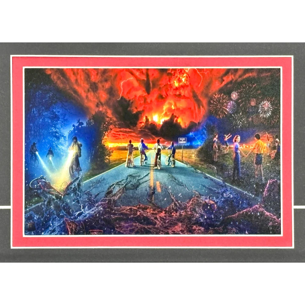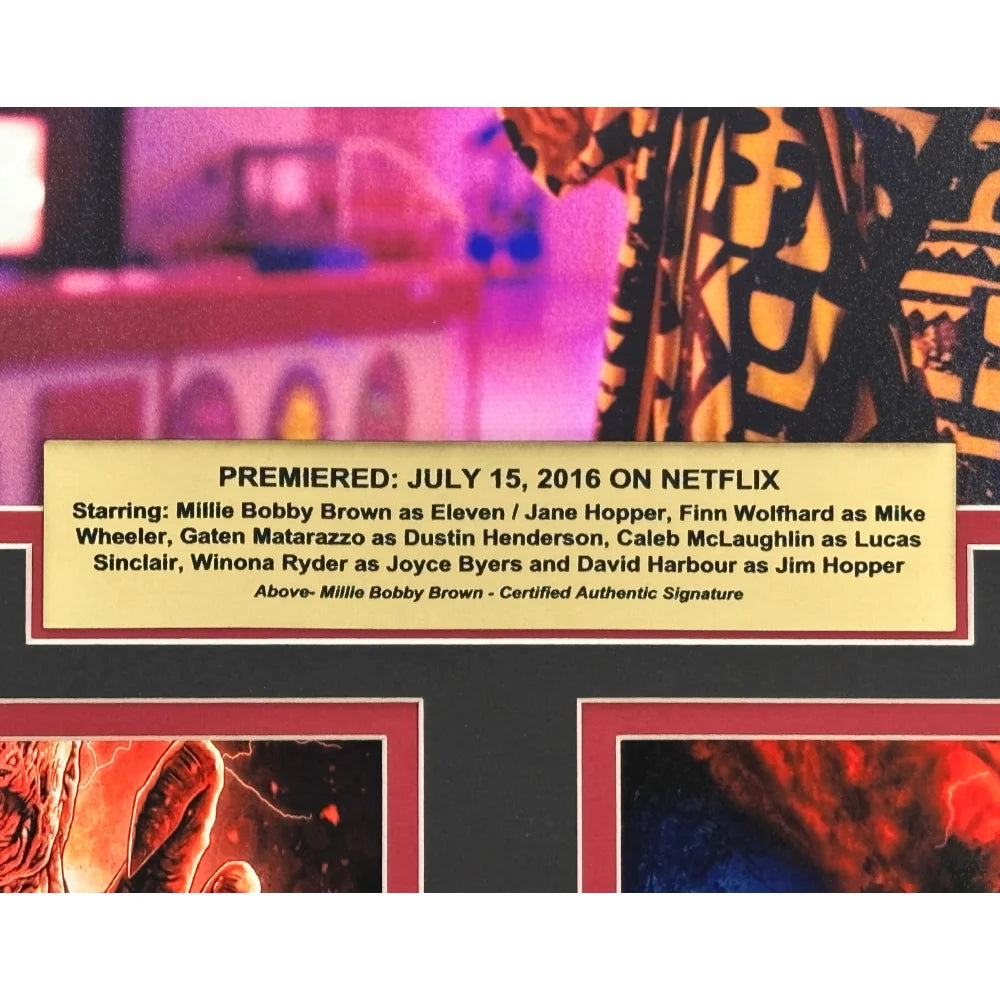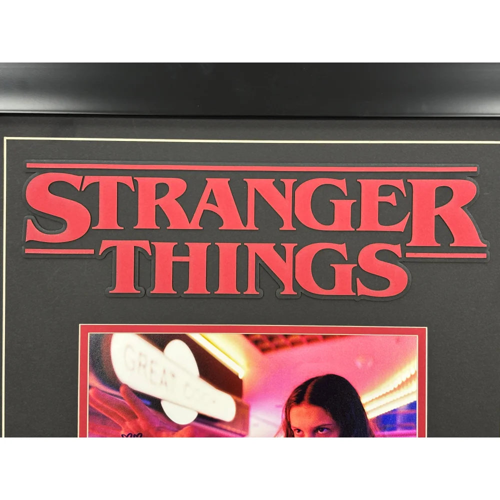 This display is crafted using super high-end, high-quality framing techniques—the same level of professional production used for museum and gallery exhibits. The piece measures approximately 19.5" x 23.5" and is finished with a sleek black frame, double matting, and a protective glass display. At the top sits a 3D laser-cut “Stranger Things” logo, raised from the background to create dimension, depth, and a premium designer look. A gold laser-engraved nameplate details information about Millie Bobby Brown and the show, completing a presentation that is both elegant and visually powerful. This type of custom framing and laser-cut design is highly sought after and typically very expensive due to the precision, craftsmanship, and materials involved. The piece arrives ready to hang with a wire-back mounting system for effortless display.