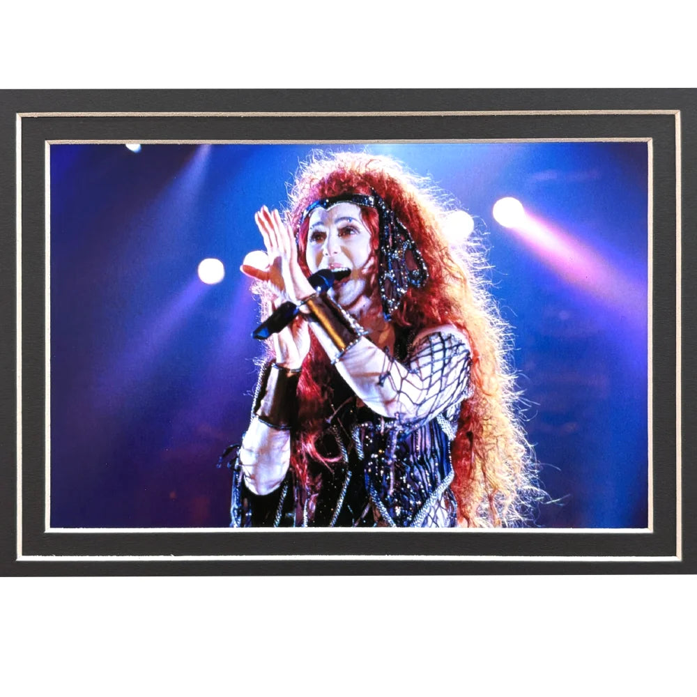 At the heart of this display is an authentic 8x10 photograph hand-signed by Cher, expertly framed for preservation. The centerpiece is complemented by two 5x7 photographs—one capturing her performing in a glittering outfit and another from her memorable Moonstruck role. A gold nameplate inscribed with “Cher” completes the presentation.