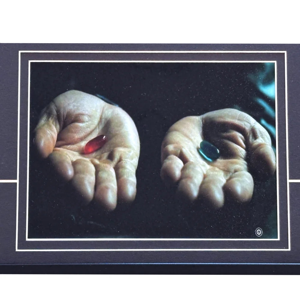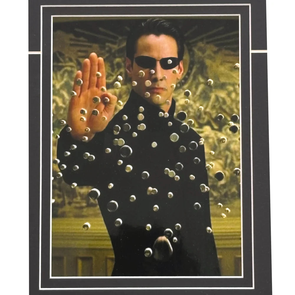 At the centerpiece of this display is an authentic photograph of Keanu Reeves as Neo, hand-signed and professionally preserved. The collage highlights Neo in a dramatic dual-gun action pose, surrounded by four additional 5x7 images showcasing unforgettable scenes: his awakening in the pod, his iconic rooftop jump, his bullet-stopping confrontation, and the pivotal red and blue pill moment. A gold engraved nameplate inscribed with “Keanu Reeves as Neo – Certified Authentic Signature” completes the design with elegance.