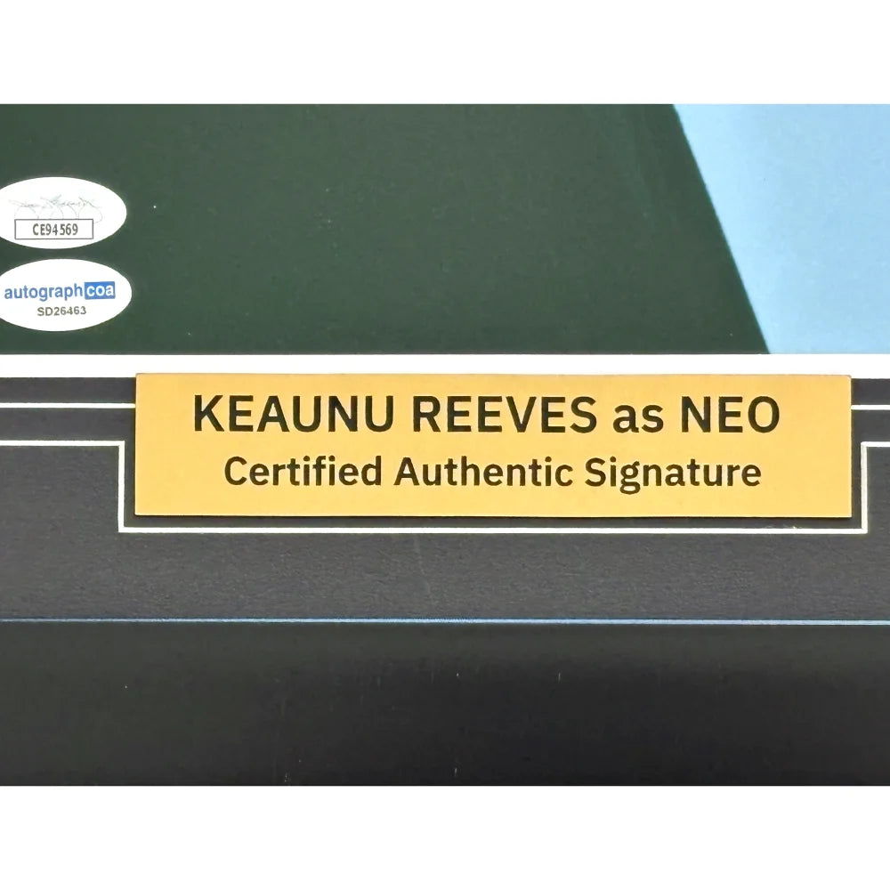 Gold engraved nameplate with “Keanu Reeves as Neo – Certified Authentic Signature” inscription