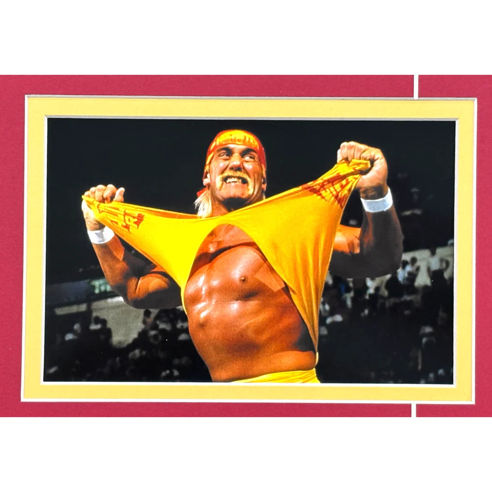 At the centerpiece is an 11x14 photograph hand-signed by Hulk Hogan, professionally framed and preserved as a rare collectible. Accompanying the autograph are six 4x6 photographs highlighting key moments from his storied career, including championship victories, epic battles, and his signature Hulkamania energy.