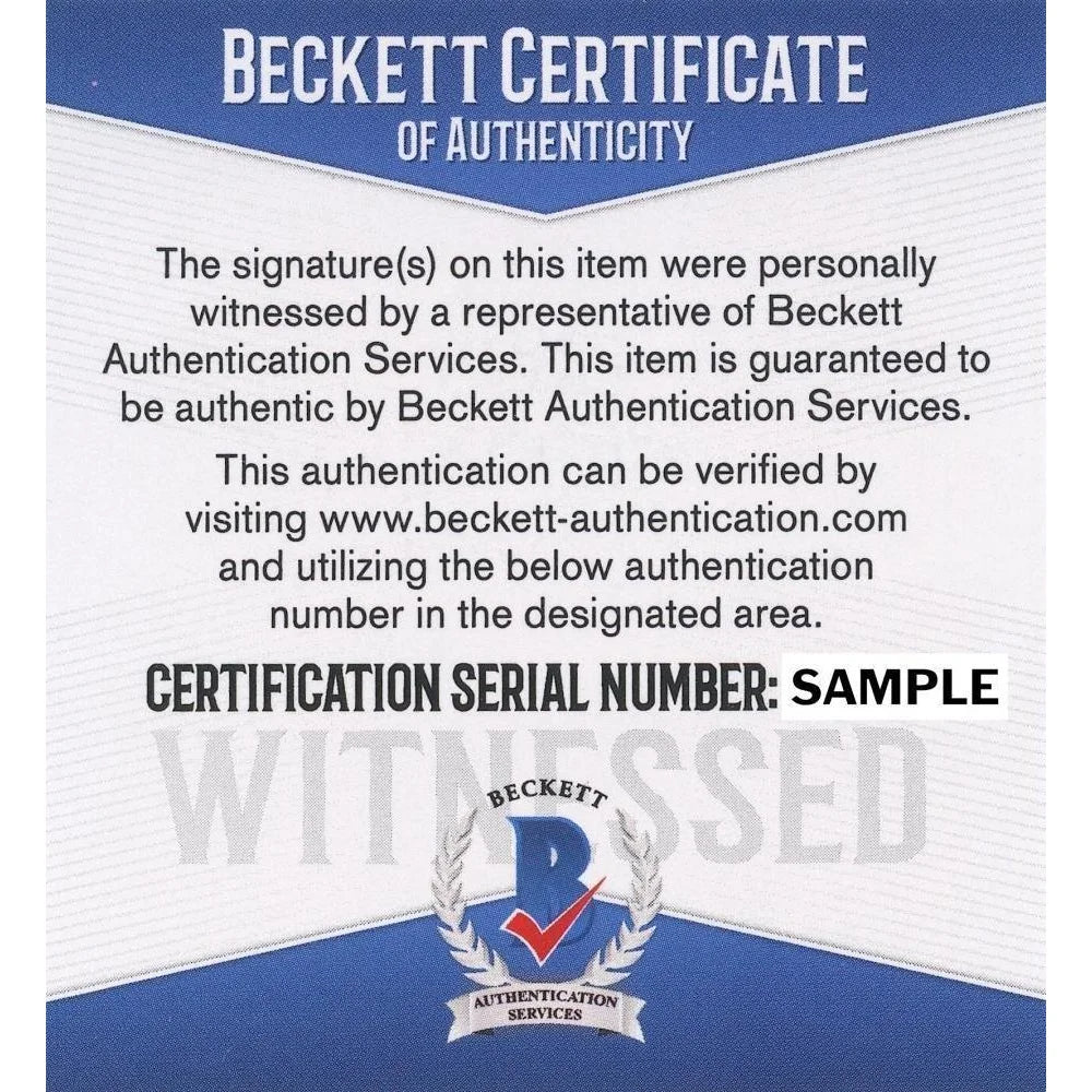 This autograph is certified authentic by Beckett Authentication Services (BAS), one of the largest & most reputable authenticators in the industry. This piece includes the BAS tamper-proof authentication sticker and identification card directly from them, which can also be accessed anytime/anywhere on their online database on their website.