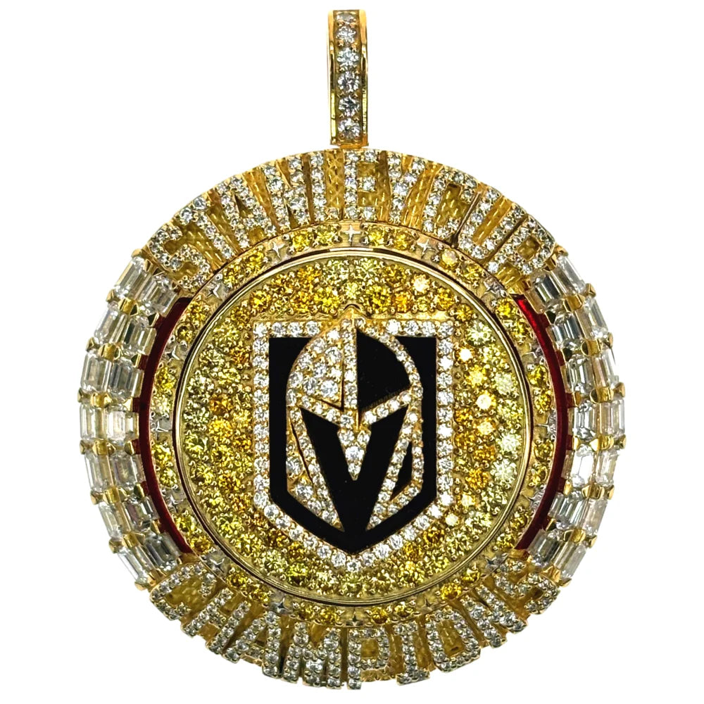 An additional interchangeable top plate is included, allowing the ring to remain visually complete while the pendant is worn separately, displaying “2023 Stanley Cup Champions” with the VGK logo centered