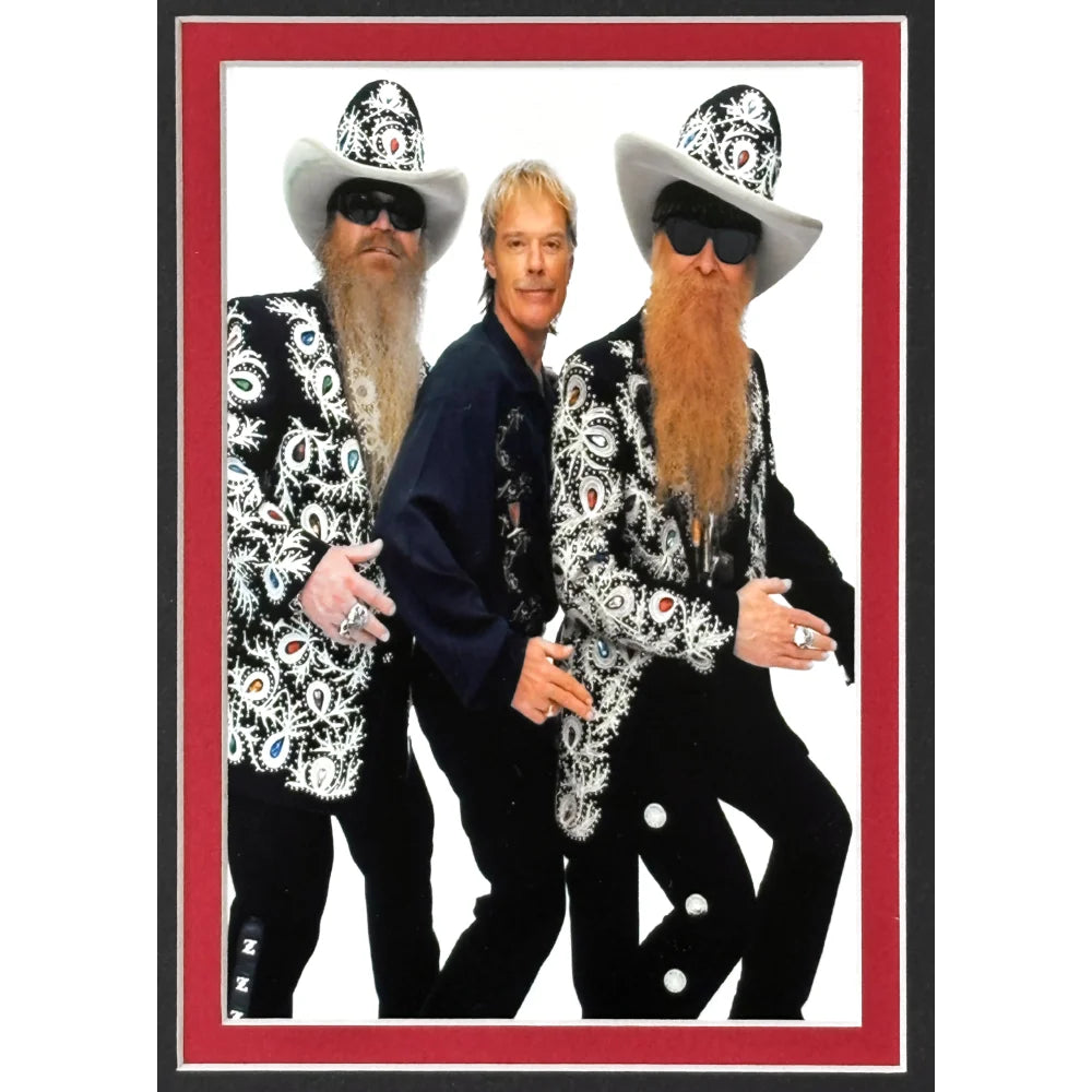 At the centerpiece is the Eliminator album cover hand-signed by Billy Gibbons in blue paint pen, professionally framed and preserved as a rare collectible. Accompanying the autograph are three 4x5 photographs capturing ZZ Top throughout their career and one 8x10 photo of the band. Also included is an original backstage pass from the 1983 Eliminator World Tour, a historic global tour that propelled ZZ Top to international superstardom. The pass, once used to grant exclusive behind-the-scenes access, represents the excitement of the era as the band performed sold-out shows across North America, Europe, and beyond, bringing their blues-rock sound and hot rod imagery to millions of fans worldwide.