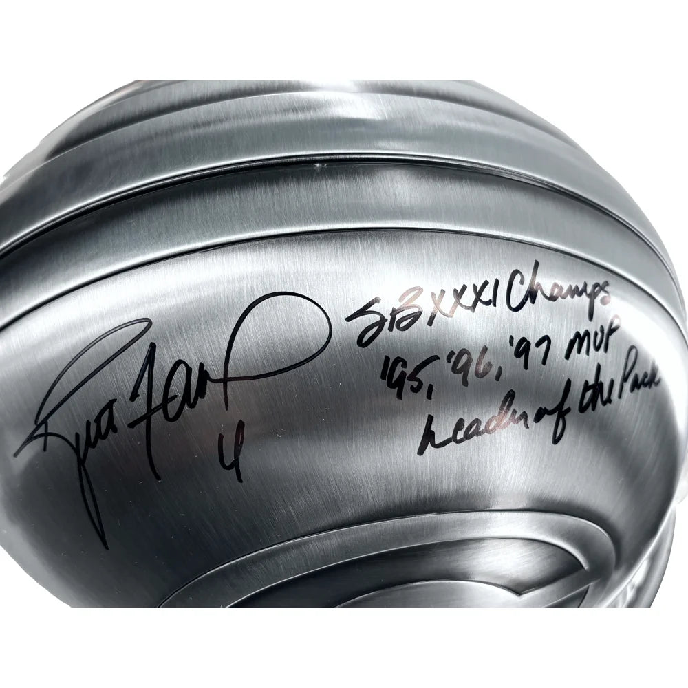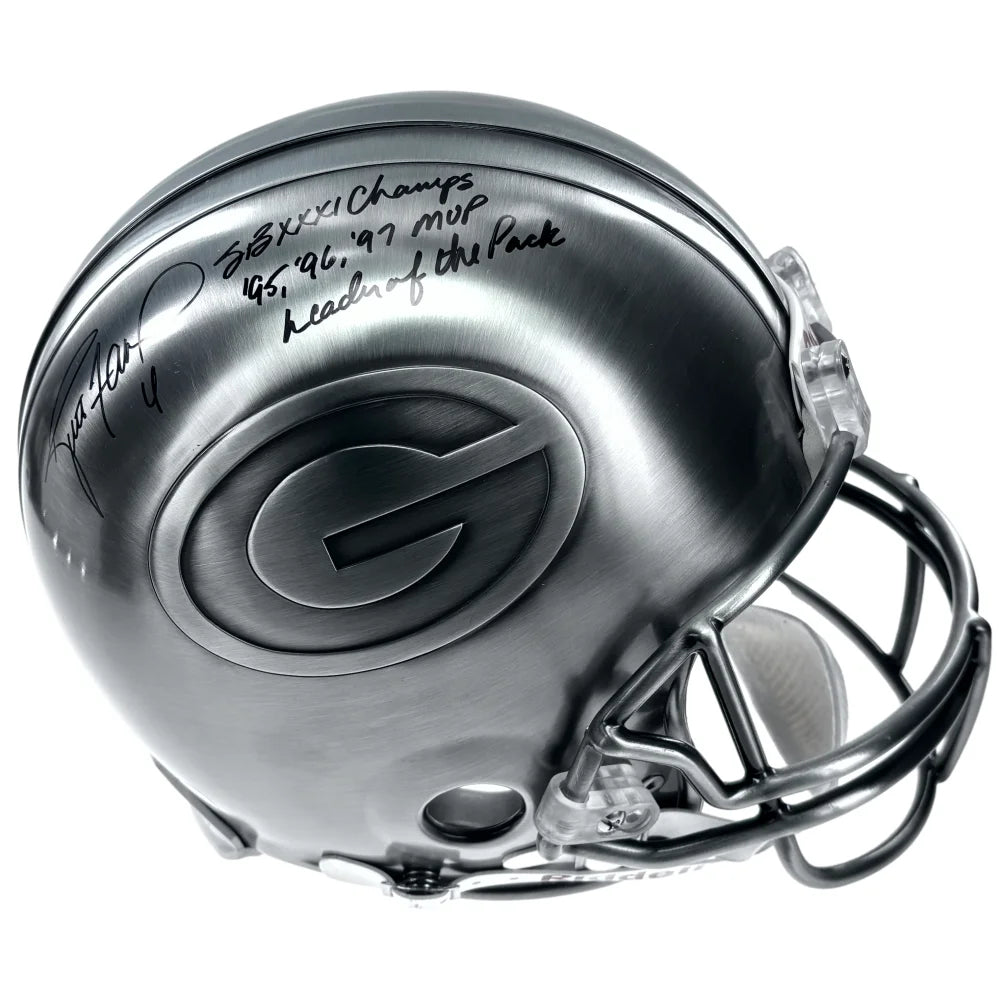 This is not a standard signed helmet. It is a limited-edition, metal-shell, multi-inscribed Brett Favre centerpiece — widely regarded as one of the rarest and most premium Green Bay Packers items a collector can own.