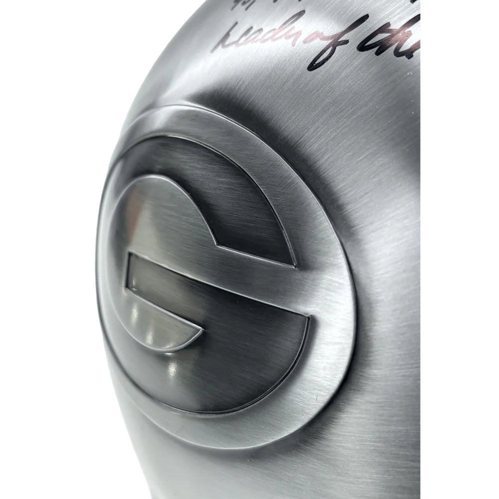 Condition Note: This limited-edition pewter helmet is nearly 20 years old and features a true metal outer shell. Because of the nature of the material and the original production process, minor surface marks, light scratches, or small manufacturing imperfections may be present. These are typical for this specific pewter-metal release and consistent with age and handling. The helmet remains structurally sound with no dents, cracks, or damage to the integrity of the shell, and it displays exceptionally well.