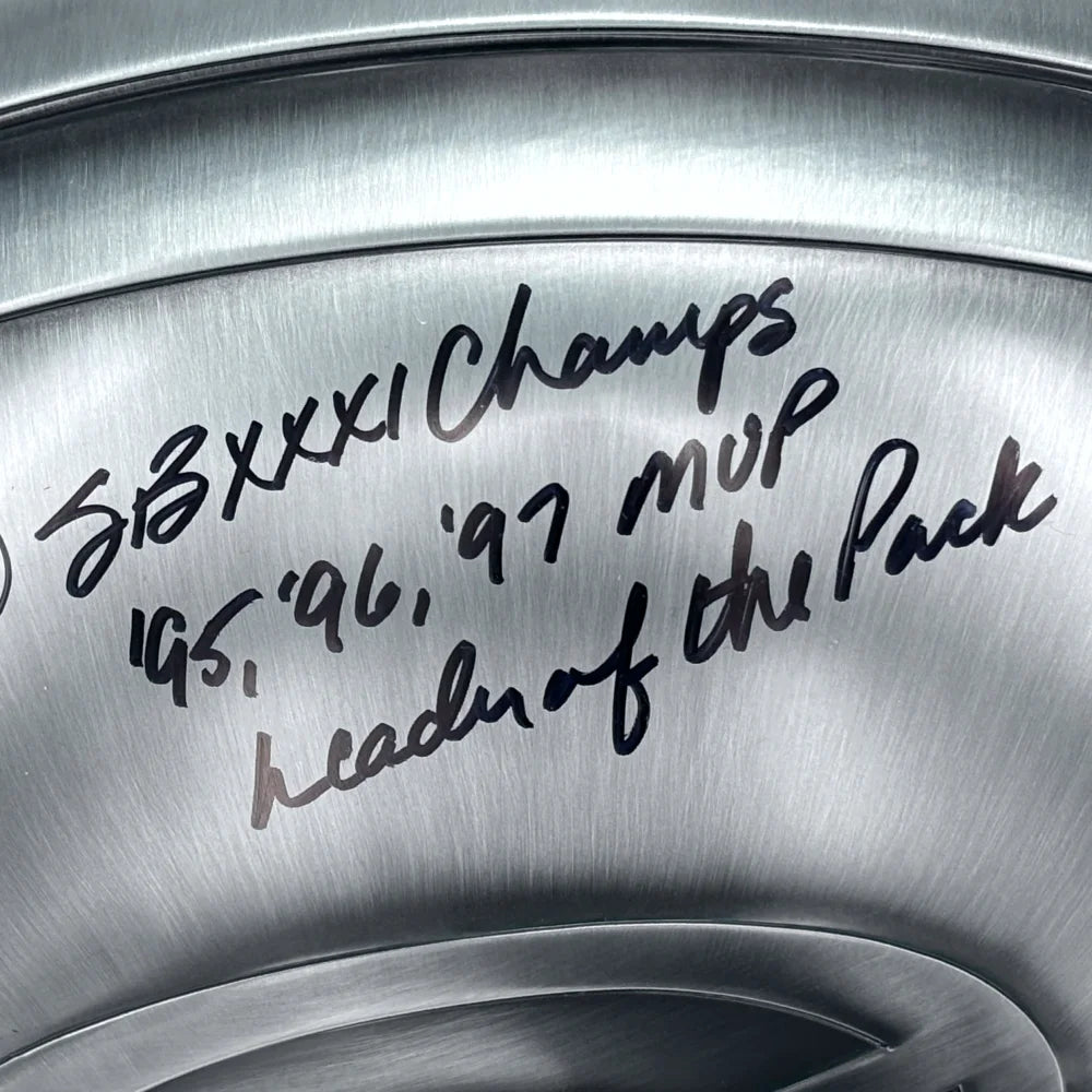 Favre has beautifully hand-signed the helmet and added multiple premium inscriptions: “Super Bowl XXXI Champs,” “’95 ’96 ’97 MVP,” and “Leader of the Pack.” These inscriptions highlight the defining stretch of his career — including the Packers’ Super Bowl XXXI championship and his historic three consecutive MVP seasons — dramatically enhancing the helmet’s historical significance and long-term collectibility.