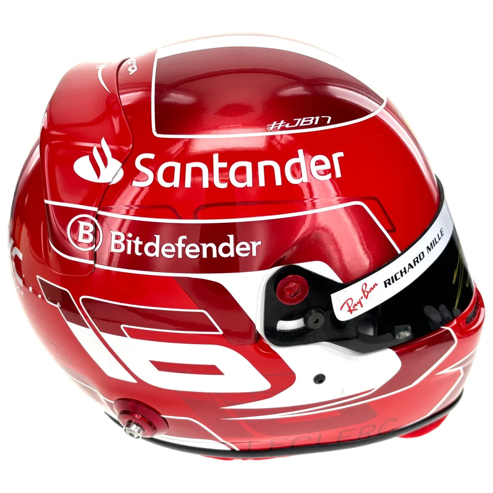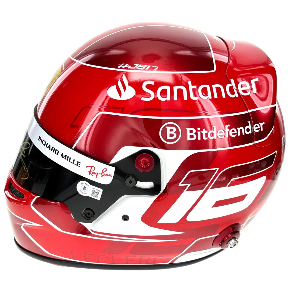 Elevate your Formula 1 collection with this Charles Leclerc Signed 2023 Ferrari F1 Helmet, a full-size 1:1 replica crafted in the same style and dimensions worn by the drivers on track. Don’t waste your time with a mini helmet—full-size helmets offer unmatched presence, detail, and display impact, making them the true centerpiece for any serious Ferrari or motorsport collector. This helmet features the complete 2023 sponsor lineup including Santander, Bitdefender, Peroni, DXC Technology, Shell V-Power, VistaJet, VGW Play, Ray-Ban and Richard Mille. The visor is personally hand-signed by Charles Leclerc in bold gold paint, and the helmet is brand new, never worn, and never displayed.