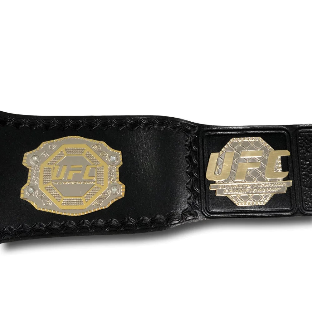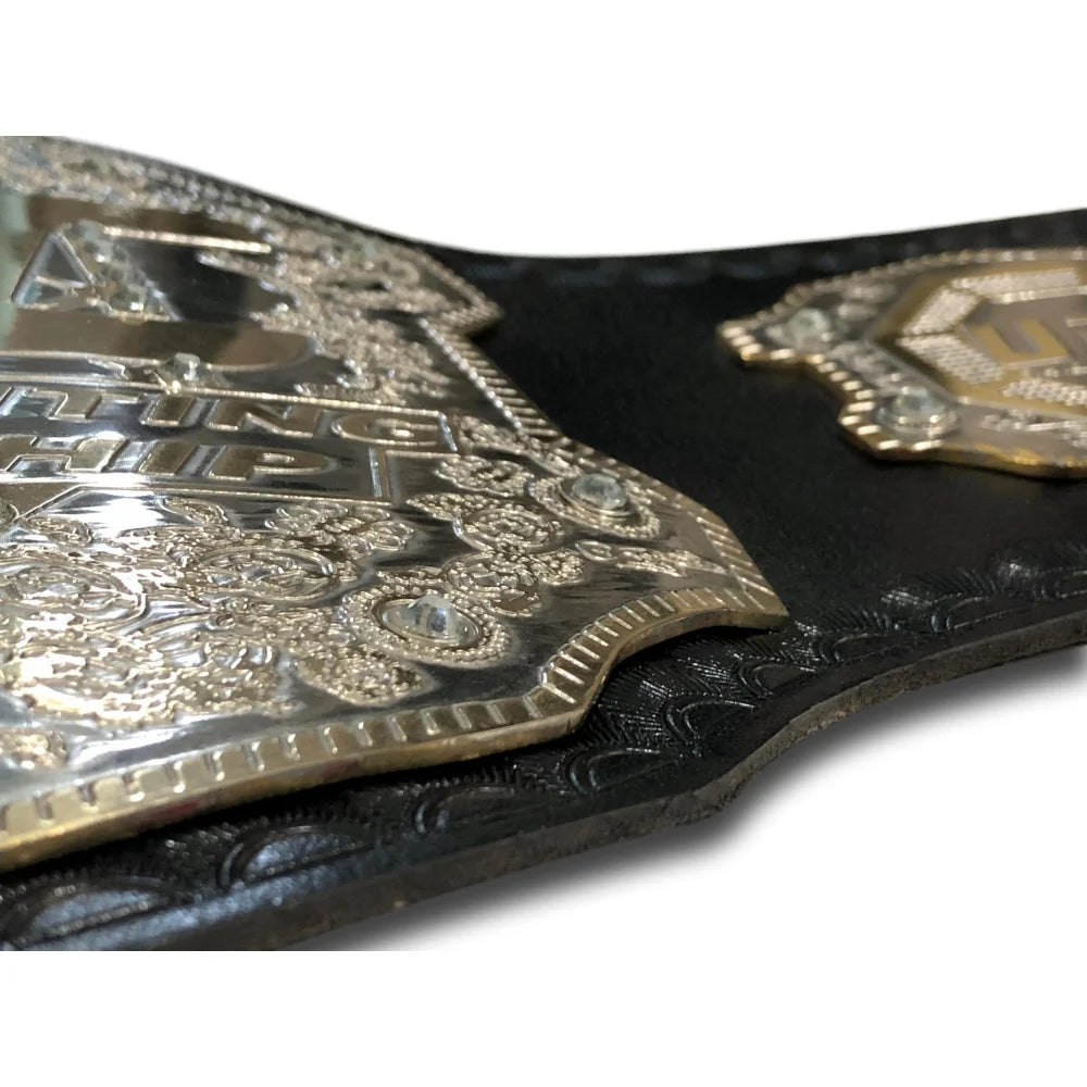 Donald "Cowboy" Cerrone hand signed replica full-size UFC belt!! This belt is signed in gold paint pen and the belt is real leather!! This belt is the highest quality replica UFC belt you will see out there, we promise you!! The only people that would have the real belts would be the fighters themselves and the fighters don't sell their belts so this is your best chance at owning the best version of their belt!! Take a look at the photos in this listing to see how detailed (Especially the pattern displayed throughout on the leather) And amazing quality this belt truly is!! The belt weighs approx. 5 pounds, real leather & 10.5" wide by 52" in length with solid brass plating throughout!! You will not find belts signed out there of UFC fighters as it is very difficult to come by high-quality replicas especially of one of the best names to ever enter the octagon, Cowboy Cerrone!!!