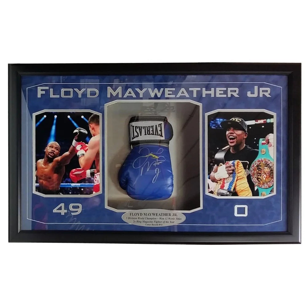 LOOKING FOR THE NEXT GREAT ITEM TO ADD TO YOUR MAN CAVE? WELL THIS IS IT! FLOYD "MONEY" MAYWEATHER SIGNED BOXING GLOVE SHADOWBOX FRAME COLLAGE! THIS BLUE EVERLAST GLOVE IS SIGNED IN SILVER INK BY "THE BEST EVER" AND THE SIZE OF THE GLOVE IS APPROX. 10" IN LENGTH BY 6" WIDE, SMALLER IN SIZE SO THIS COLLAGE IS NOT CONSIDERED OVERSIZE. THIS CUSTOM FRAME FEATURES BLUE & SILVER SUEDE MATTING, A GLASS DISPLAY, A NAMEPLATE THAT DEPICTS INFORMATION ABOUT MAYWEATHER, 2 8X10 PHOTOS FROM ICONIC MOMENTS IN HIS CAREER AND LASER CUT OUT LETTERING THROUGHOUT THE ENTIRE PIECE! MUSEUM QUALITY TO SAY THE LEAST! FRAME MEASURES IN IT'S ENTIRETY, 33" X 20 1/2" X 5 1/2".