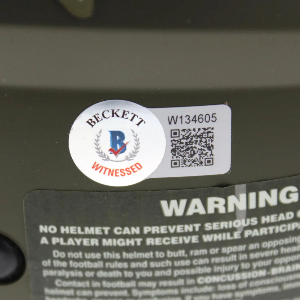 This helmet is the exact authentic model worn by players on game day, made by Riddell, featuring the same internal padding and construction used on the field. It showcases the official Salute to Service design, which the NFL uses to honor and recognize our military veterans and active-duty service members throughout the month of November during Military Appreciation Month. The helmet’s unique camo-inspired coloring is part of this exclusive initiative and is only worn by players during November games.