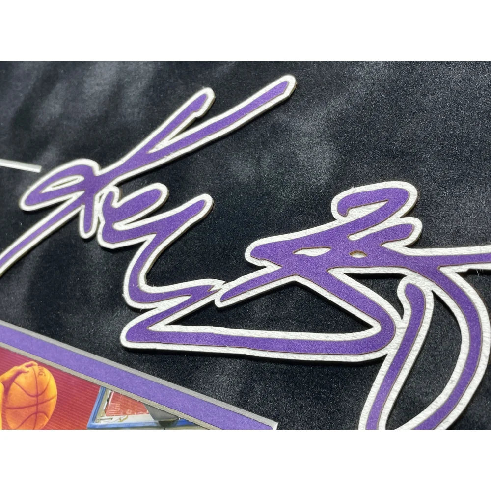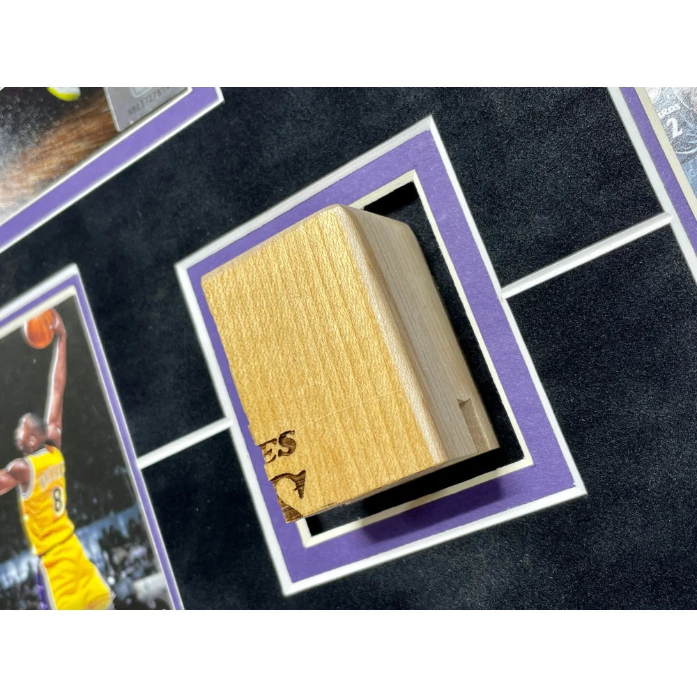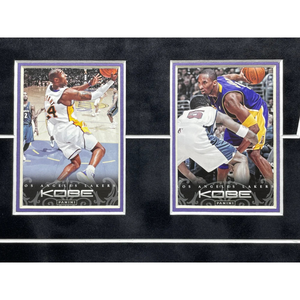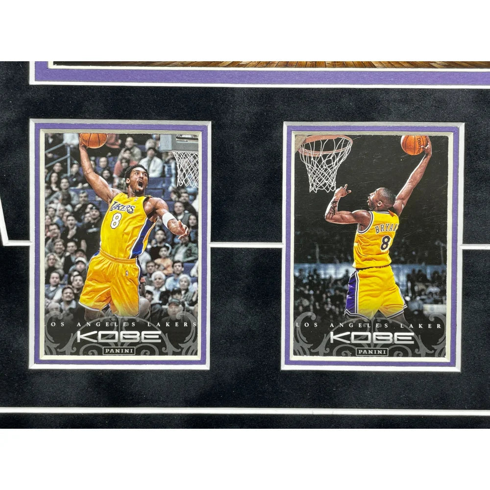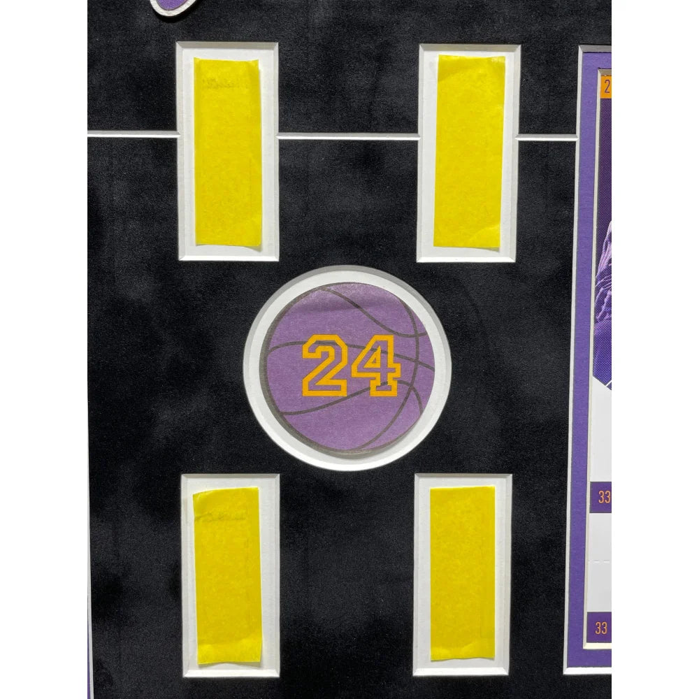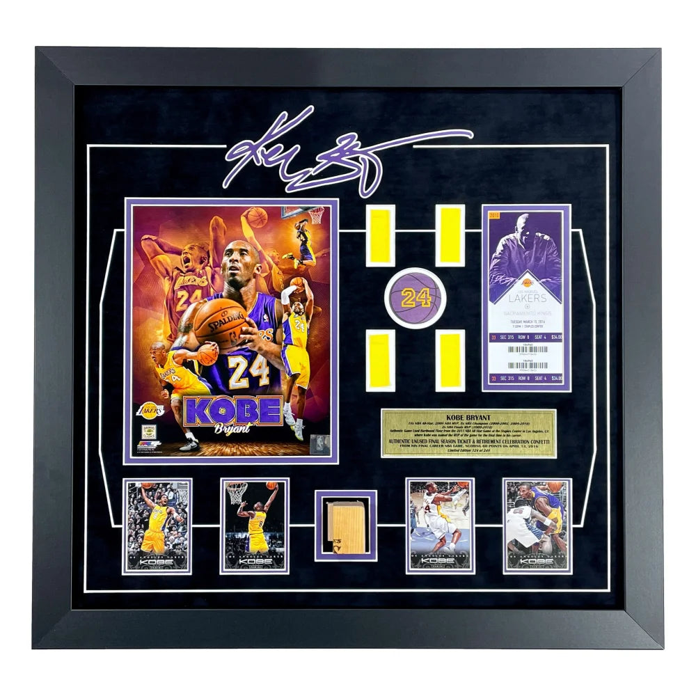 This piece comes professionally museum quality custom framed as a shadowbox in team color matting, a black frame, an 8" x 10" photo, a laser cut Kobe Bryant facsimile signature at the top of the collage, a gold nameplate depicting information about some of Kobe's career accolades and the confetti, a plexiglass display with 4 authentic Kobe trading cards. This frame measures approximately 23.5" x 22.5" x 2" in size.
