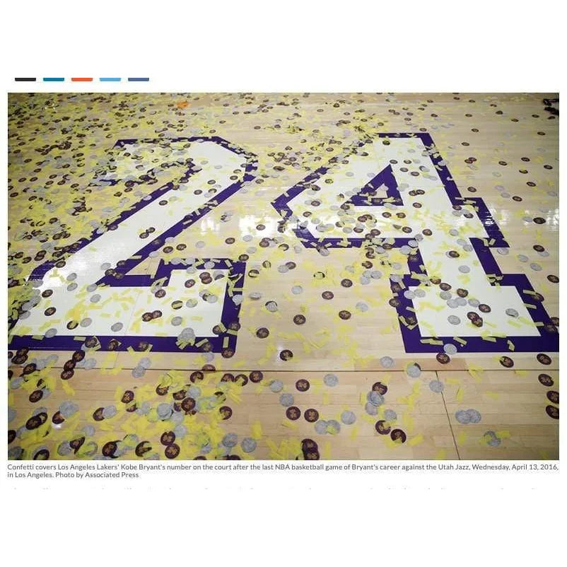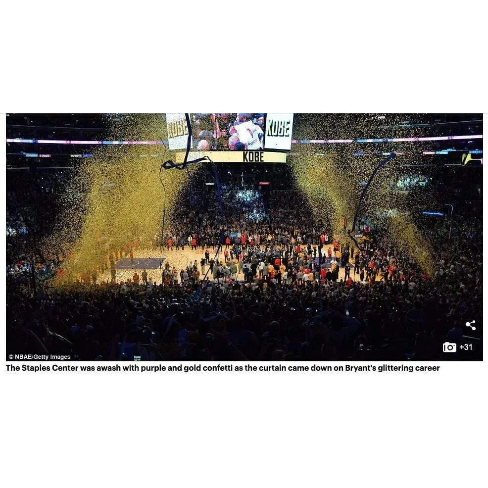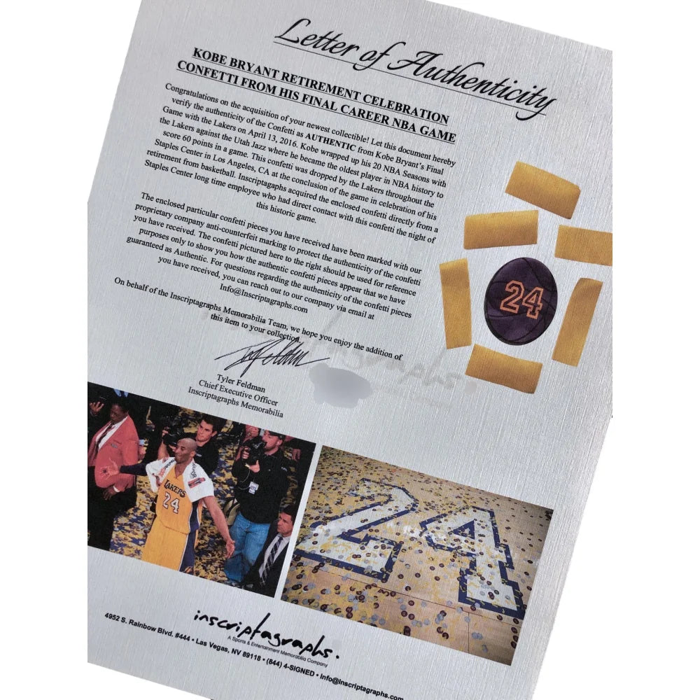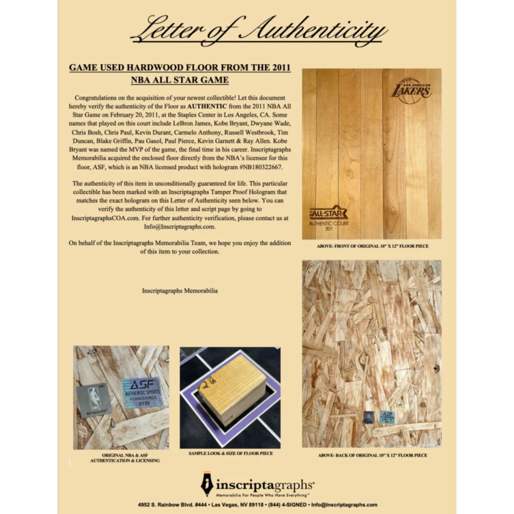 This piece comes with 2 Letters of Authenticity from Inscriptagraphs Memorabilia, guaranteeing these enclosed confetti are AUTHENTIC and from his final game as well as the floor is from the 2011 NBA All Star Game. Each letter is hand signed by our CEO of our company. Inscriptagraphs, if you are not familiar us, is one of the largest and most reputable memorabilia companies in the United States with one of the largest online presence for memorabilia in the United States. All confetti enclosed in this confetti collage was acquired directly from a longtime Staples Center employee who had direct contact with this confetti the night of the historic game. The floor was acquired directly from the owner of the 2011 All Star Floor, who has a contract in place with the NBA as a licensed product. This confetti & floor are guaranteed authentic via Inscriptagraphs' Authenticity Guarantee, which can be found on our website and includes the Letter of Authenticity.