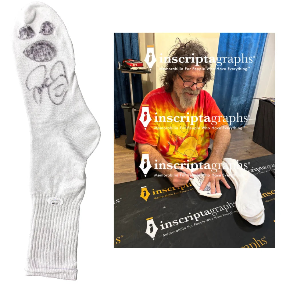 Please Note:Ā This is a stock listing using a representative image. Each Mr. Socko is unique, and you will receive a randomly selected left or right sock with hand-drawn artwork and autograph by Mick Foley. Variations in drawing style, placement, and signature are natural and part of what makes each piece one of a kind.
