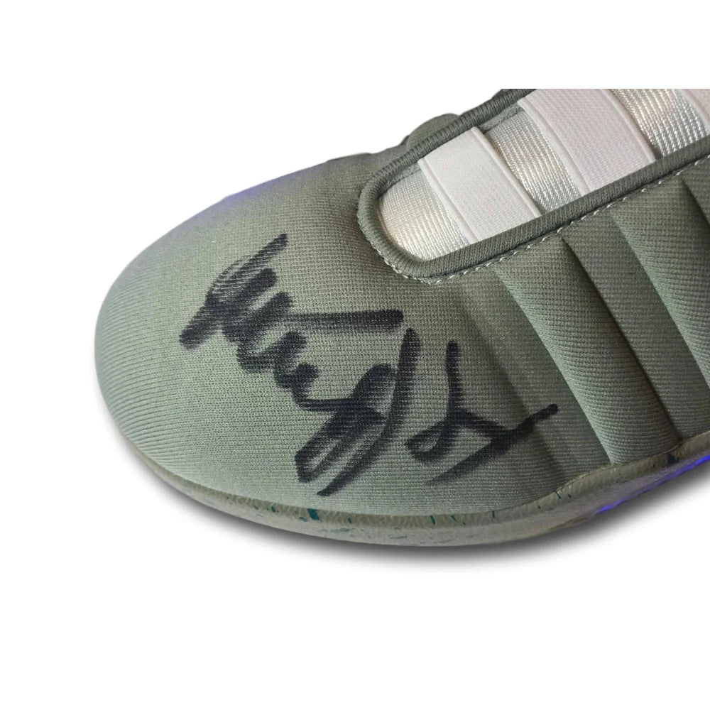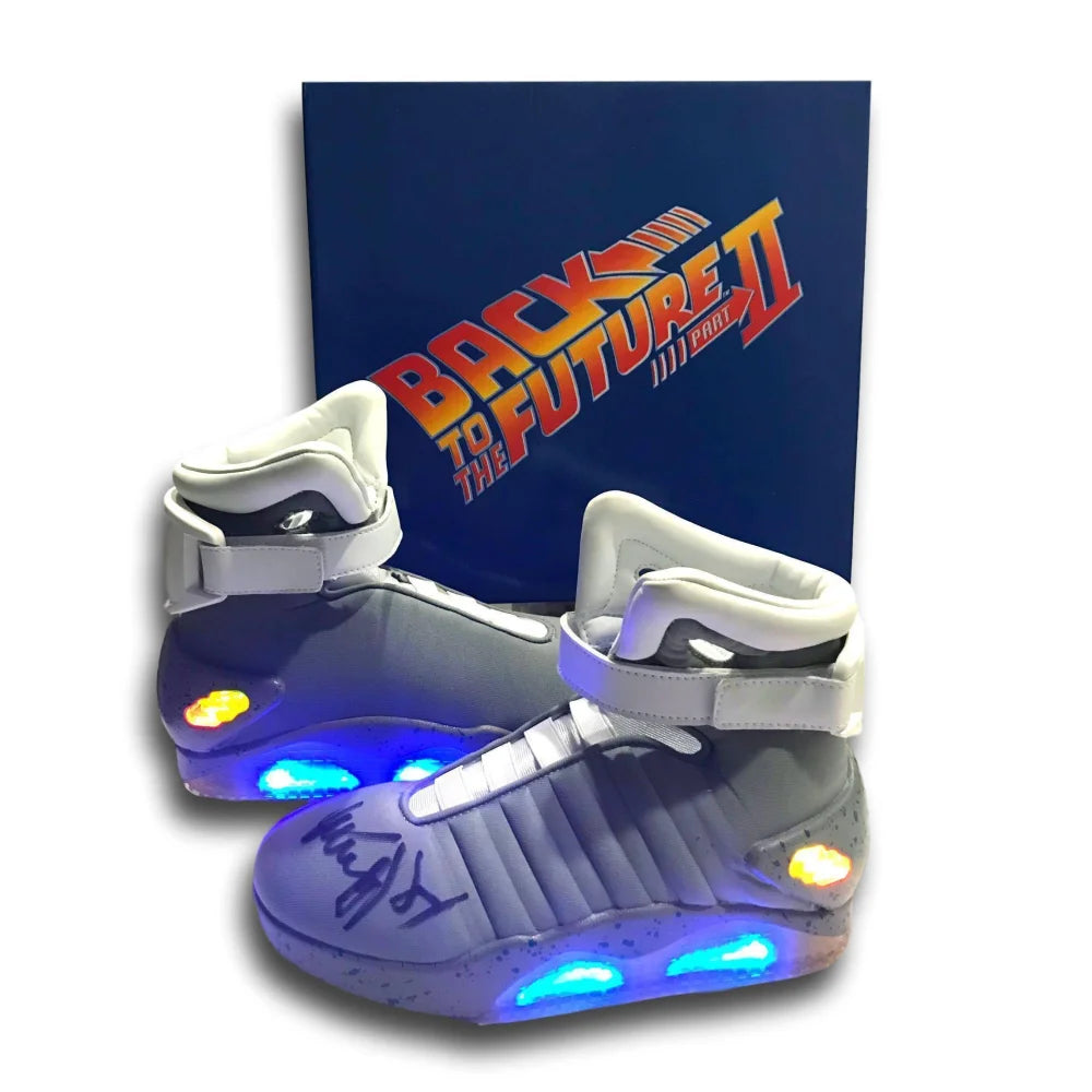 Looking for that next unique item to add to the man cave? Well, this is it! Michael J. Fox autographed air mag back to the future shoes!! This is a must have for all back to the future fans! This pair of size 9 shoes has been autographed by Marty McFly himself and comes in the original box as pictured in the photos! What is very cool about this pair is that they actually light up as depicted in the photos. Fox signed this pair of shoes on the left shoe only and includes the charging chords & back to the future box so you can light up both shoes. These shoes are licensed universal studio shoes released to be the same shoes like the ones from the movie! Grab these before they go as they will not last long!!