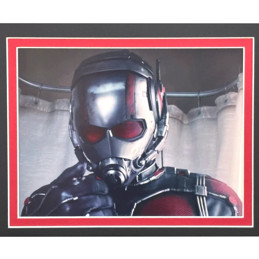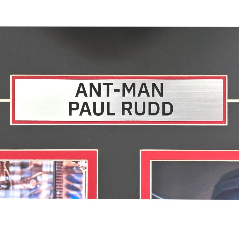 At the centerpiece of this display is an authentic Ant-Man mask hand-signed by Paul Rudd, professionally preserved for long-term protection. Complementing the signed mask are two 5x7 photographs: one featuring Rudd in his full Ant-Man suit, and another capturing the character in an action-packed scene.