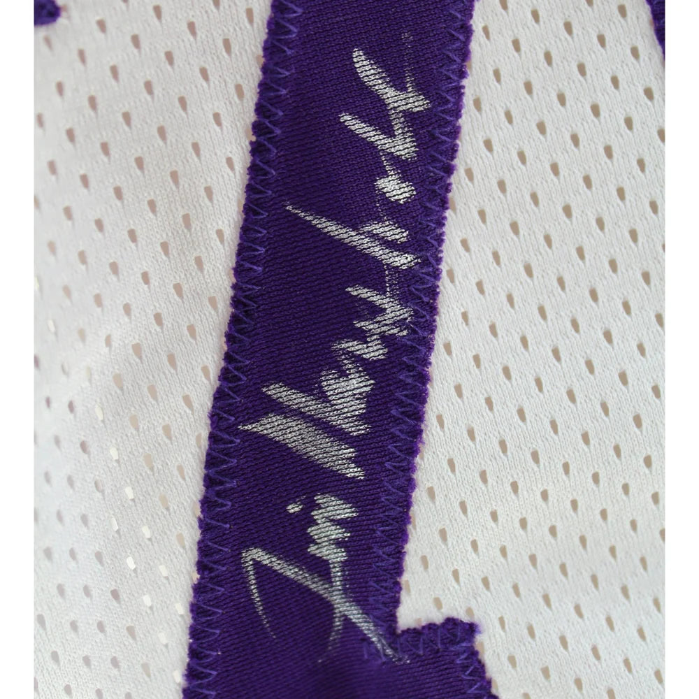 This is a custom-made, white, size XL jersey inspired by the classic Minnesota Vikings look. It features no official team or league logos, making it a clean, display-focused collectible. The bold purple and gold stitched numbers pop against the white background, providing the perfect canvas for all four autographs — a visually striking and highly collectible piece of football history.