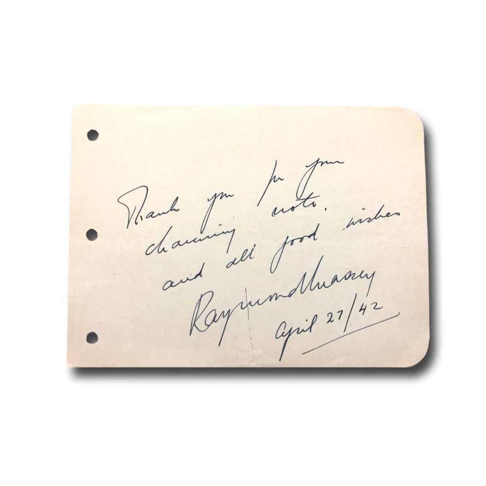 Item: Raymond Massey hand signed album page!!! This tan album page measures approx. 4.5" x 6" in size. This is a must have item for all fans of the ICON!! Autographs of his are very difficult to come by as he died way back in 1983!