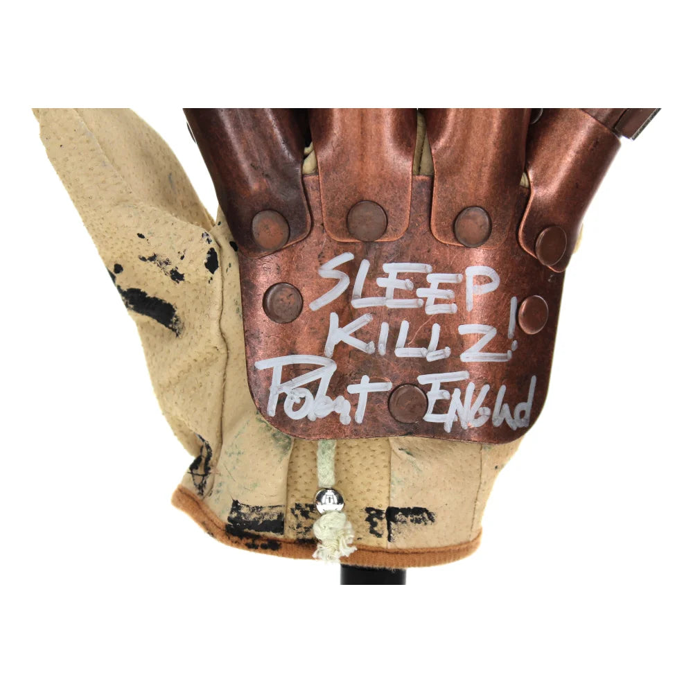 Adding to its rarity and appeal, the glove is boldly inscribed with “Sleep Killz.” Robert Englund most commonly signs only his name, making inscribed pieces far less common and significantly more desirable. This inscription ties directly into the Freddy Krueger mythology and elevates the glove into a true one-of-a-kind display centerpiece.
