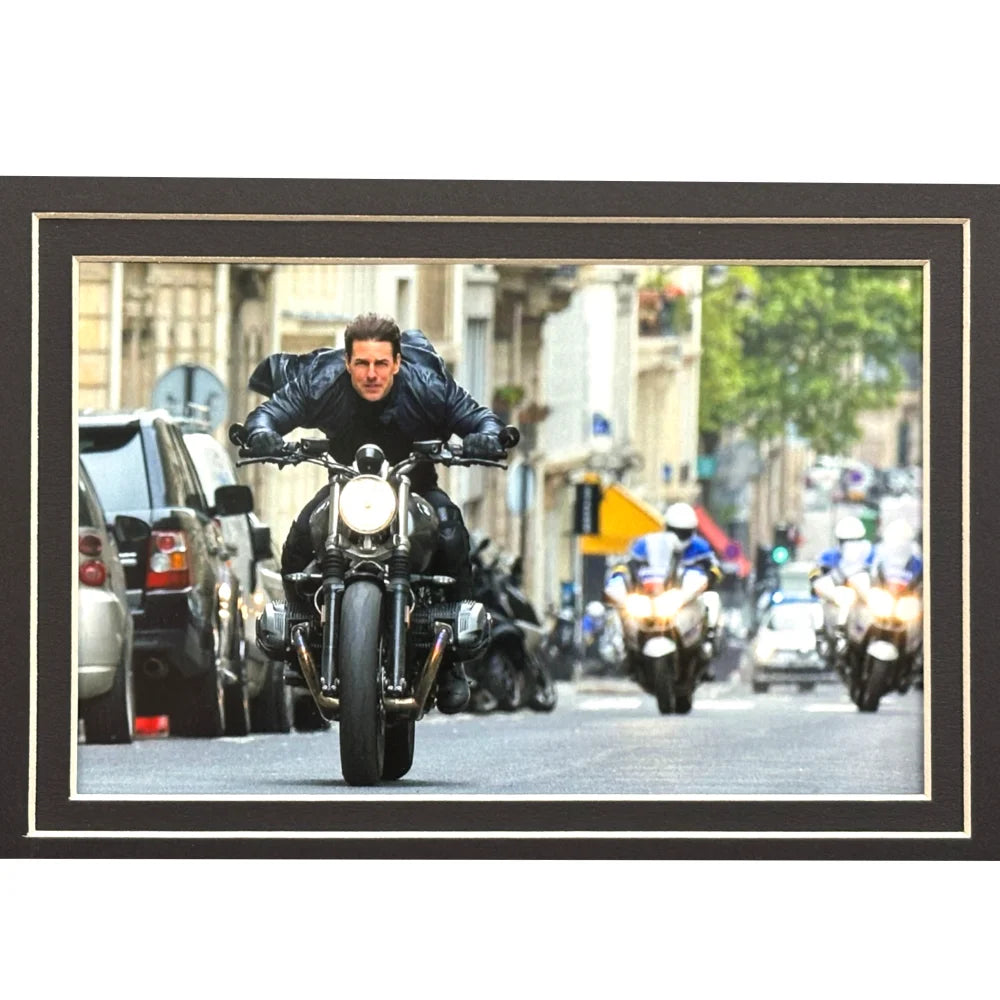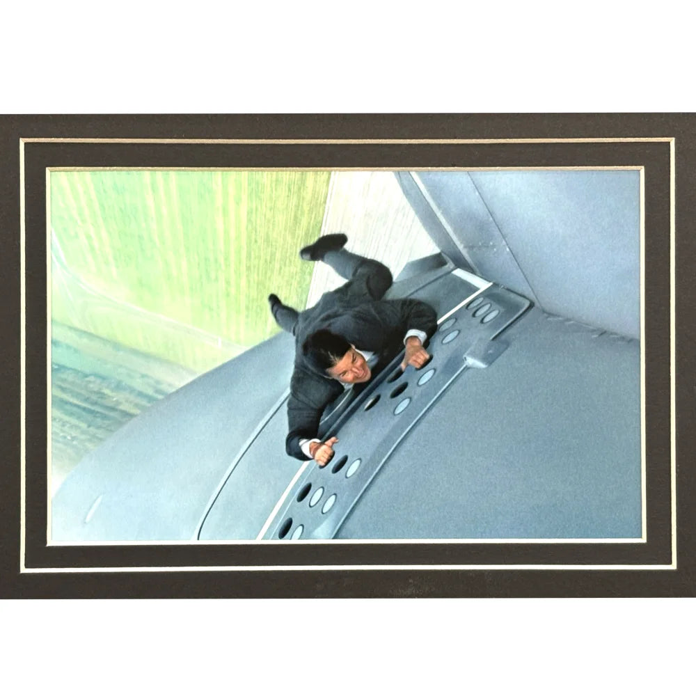 At the heart of this display is an authentic 8x10 photograph hand-signed by Tom Cruise, expertly framed for preservation. The centerpiece is complemented by four 4x6 photographs from various Mission: Impossible movies, capturing some of his most legendary stunts. A gold nameplate reading “Tom Cruise” adds a distinguished touch.
